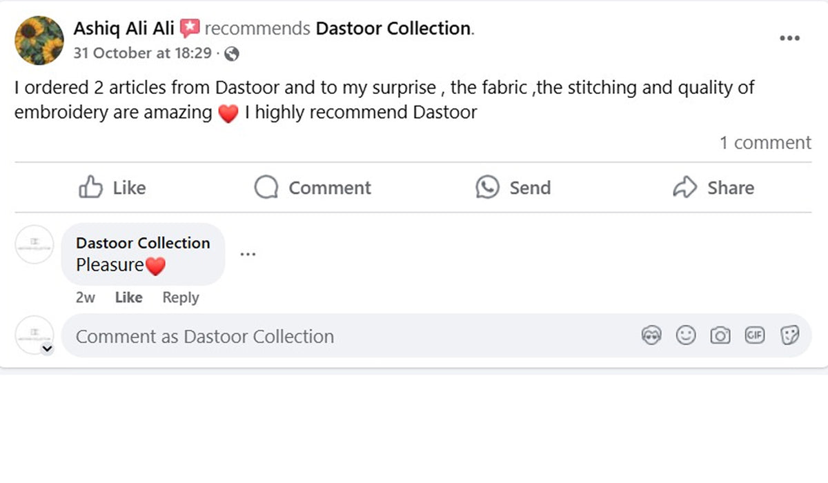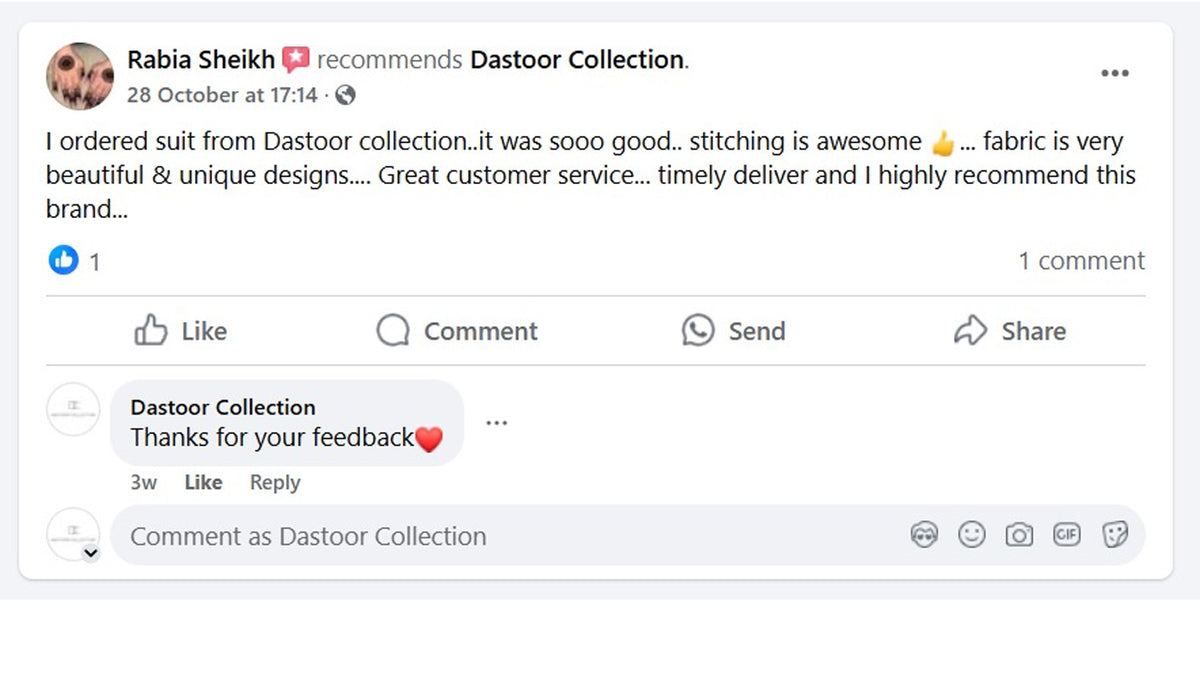 I ordered from overseas and am overly impressed with Dastoor Collection’s customer service, quality and pricing. I needed the stitched saree for an important event and Dastoor’s team delivered my order few days earlier than they had promised on my short notice order. I will be ordering more articles for sure. Thanks Salman and others. Five stars.
