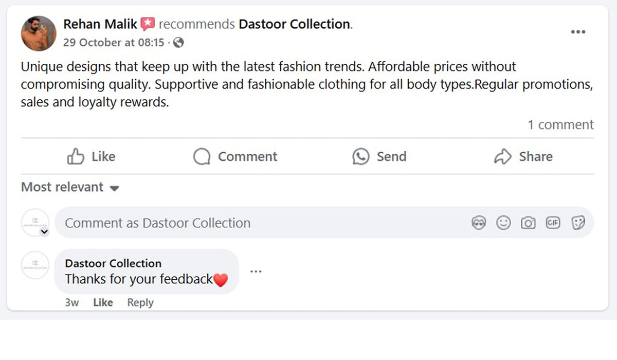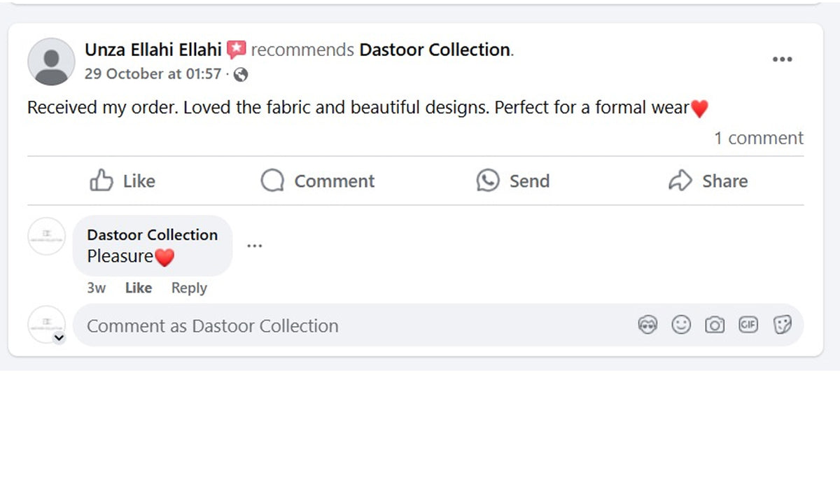 Great customer service, they really listen to what you need. The quality of clothes is so good and fit so well. I ordered 3 outfits and all of them are gorgeous. No threads coming out and no beads missing. First time i was not disappointed with my parcel from pakistan.