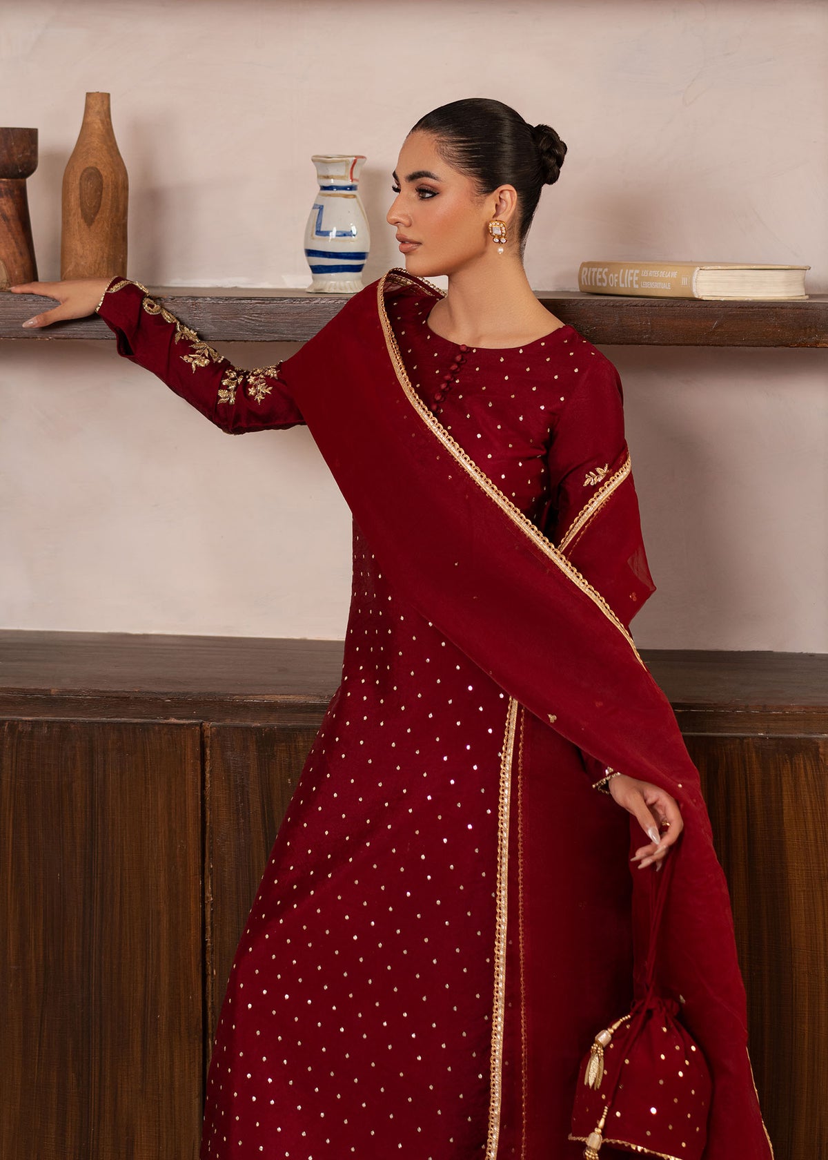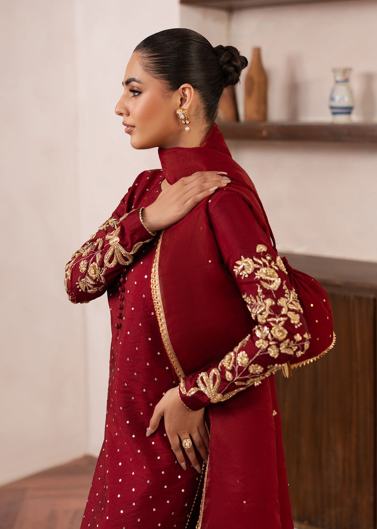 Command attention in rich mahroon red. This ensemble features a tissue silk shirt and trouser, complemented by a sheer organza dupatta. Intricate accents evoke timeless sophistication, perfect for those who love classic opulence.